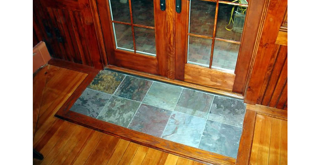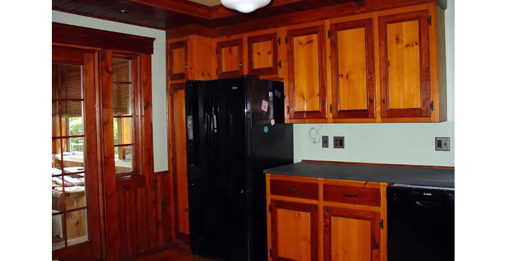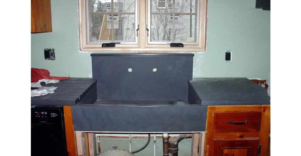 Angie's Kitchen Project features a soapstone counter and sink, refinishing existing cabinets and giving them a facelift as well as repairing the existing wood floor with patchwork as the homeowner wanted to maintain an aged and worn look to them.